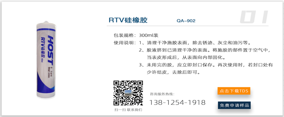 RTV硅胶(室温硫化型硅橡胶)作为粘接、密封、绝缘、防潮、防震材料,广泛应用于电子元件、半导体材料、电子电器等设备的粘接、密封,电加热器、电子仪表的防水、密封及电子元件的灌封等。具体如电加热末端的密封、小马达磁瓦和金属外壳的粘接、汽车车灯、光学仪器和镜头的粘合密封、电子仪表外壳的粘合、电机的绝缘保护、电子元件的粘合密封等。RTV硅胶具有良好的粘接性能,固化物电气绝缘性能优良,具有防潮防震功能。无毒、无污染、无腐蚀。具有良好电绝缘和抗电弧性能,耐老化、防潮,有良好的粘接性能。适用于—60℃~200℃工作温度。